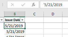 So to solve this issue in Excel I have found a solution online that says to put an apostrophe in front of the date like so: